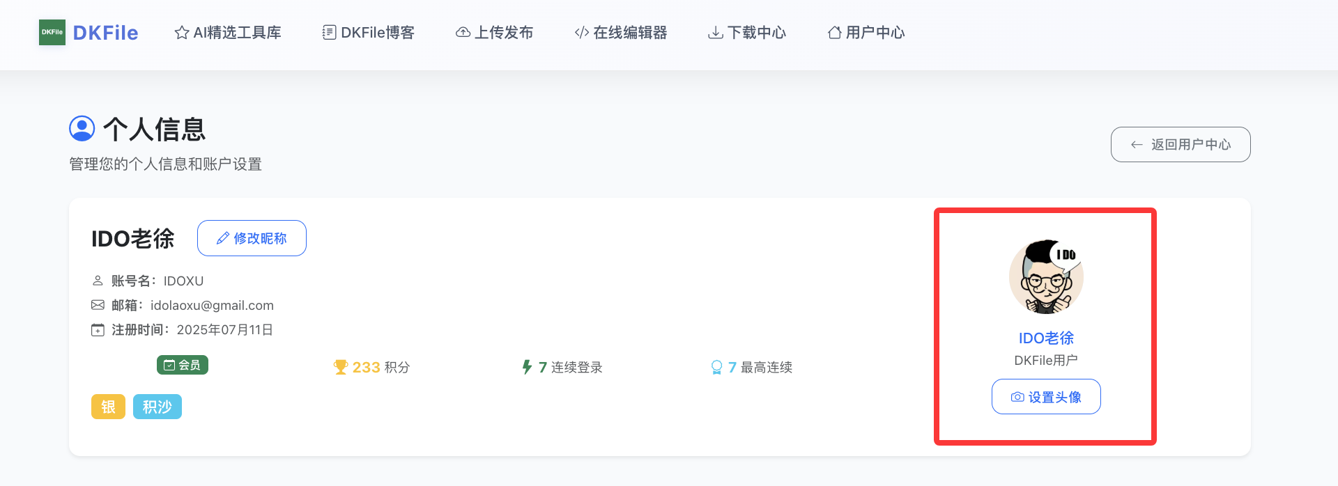 个人信息修改页面,增加了头像设置入口,以及显示你的炫酷个人头像