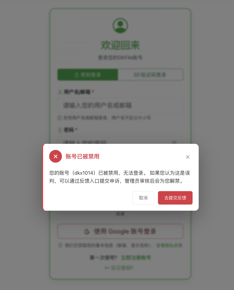 DKFile 账号禁用,做了登录提示,并支持申诉,