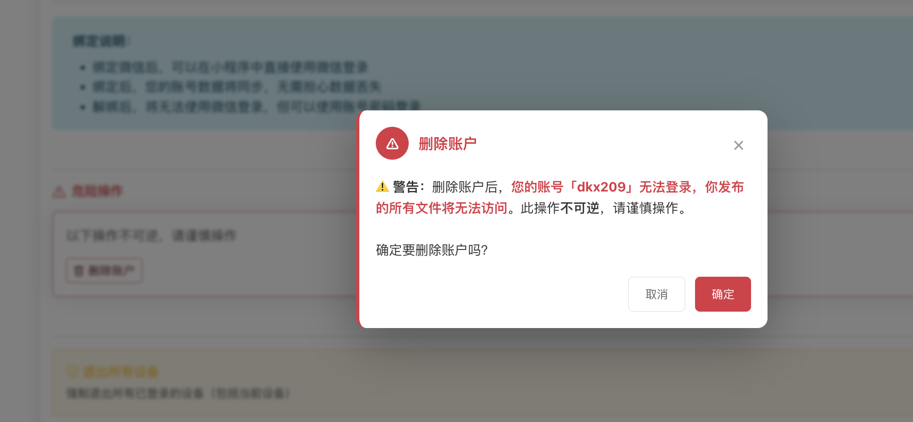 新增「删除账户」功能,支持用户主动删除账户,删除后,账号禁止登录,所有文件无法访问